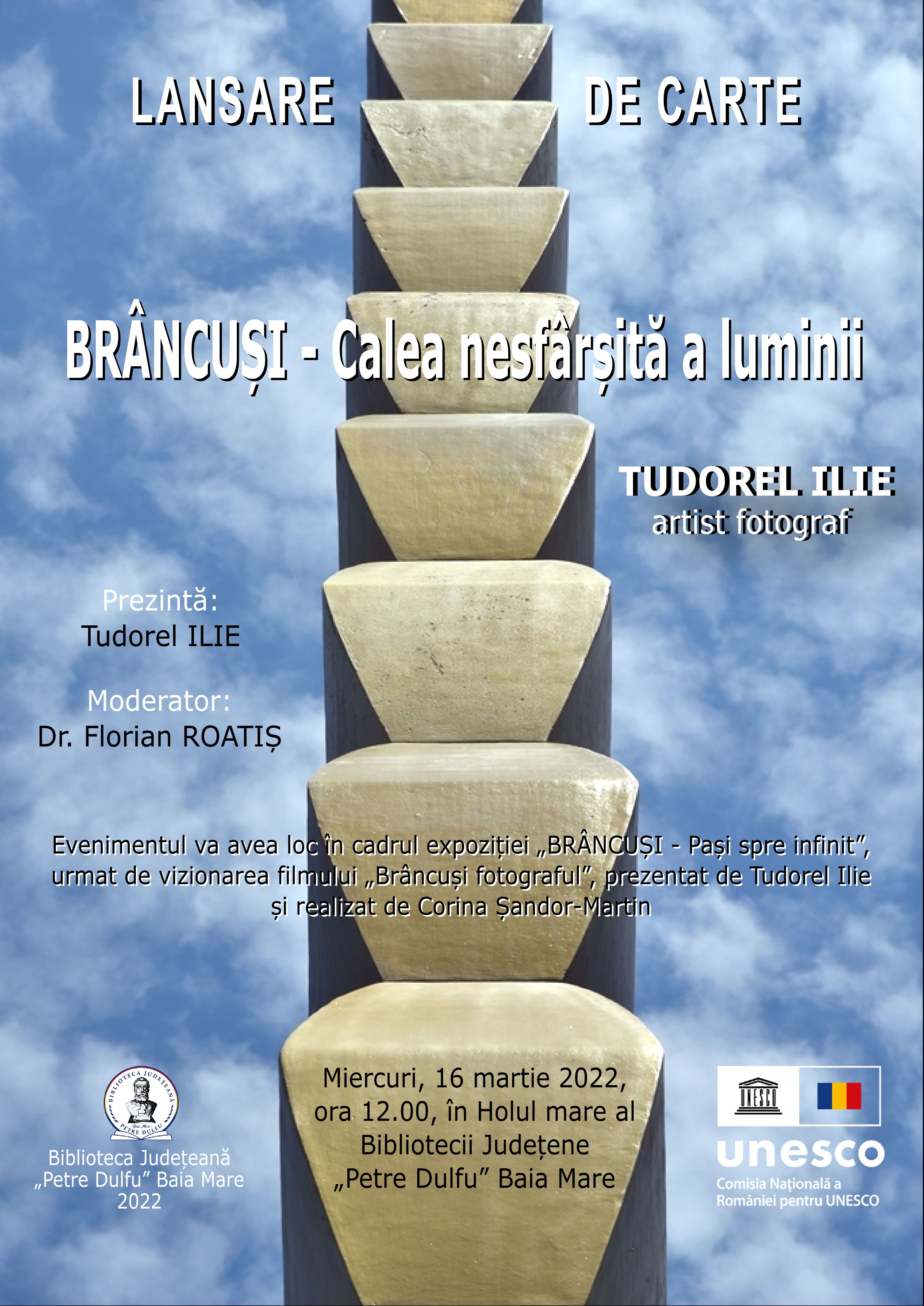 Cu ocazia comemorării a 65 de ani de la moartea sculptorului român Constantin Brâncuși, Biblioteca Județeană „Petre Dulfu” în colaborare cu artistului fotograf băimărean Tudorel Ilie organizează lansarea volumului „Brâncuși – calea nesfârșită a luminii : expoziția personală de artă fotografică itinerantă desfășurată sub patronajul Comisiei Naționale a României pentru UNESCO”, apărută în anul 2022, în cadrul programului cultural „România din inimile noastre”, coordonator: dr. Teodor Ardelean.
