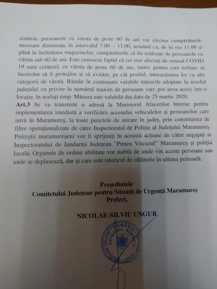 Va reamintim faptul ca de maine va intra in vigoare masura dispusa de CJSU Maramures, aceasta fiind initiata de seful CJ Maramures si sprijinita de prefectul de Maramures, Silviu Ungur votata in unanimitate de catre toti membrii CJSU. Decizia are trei articole de hotarare extrem de importante.