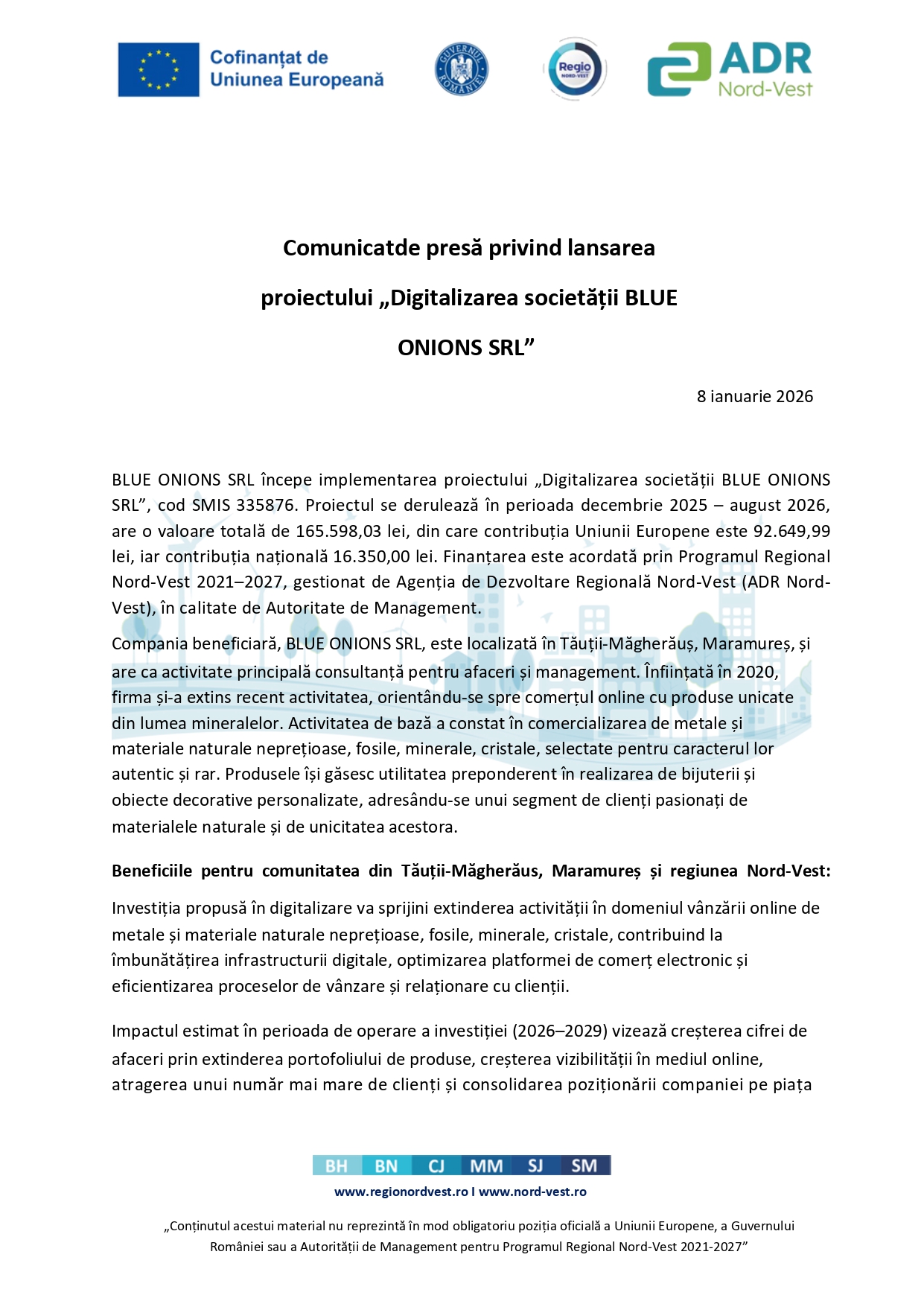 Compania beneficiară, BLUE ONIONS SRL, este localizată în Tăuii-Măgherăuș, Maramureș, și