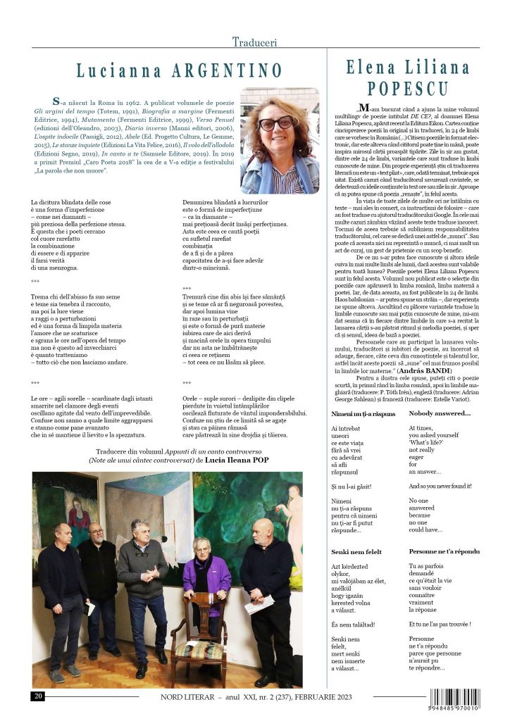 Nu lipsesc premianții din acest număr, în care sunt alocate spații importante poeziei Mihaelei Ungureanu (Premiul Revistei de Cultură ”Nord Literar” la Festivalul de Literatură de la Cicârlău, decembrie 2022) și prozei Cătălinei Steriu (Marele Premiu la Festivalul de Literatură de la Cicârlău, decembrie 2022).