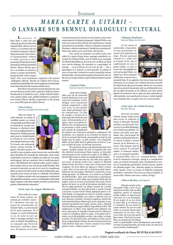 Acest număr este ilustrat cu imagini de la ”Nord Literar – Dialoguri culturale”, eveniment în cadrul căruia scriitorul Gabriel Chifu – director executiv al revistei ”România literară” și-a lansat volumul ”Marea carte a uitării” la Baia Mare.