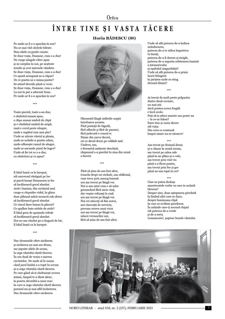 În pagina dedicată aniversării lui Horia Bădescu, textele sunt semnate de Irina Petraș și Gheorghe Pârja, iar pagina ”Orfeu” publică versurile poetului care, în 24 februarie, a împlinit 80 de ani.