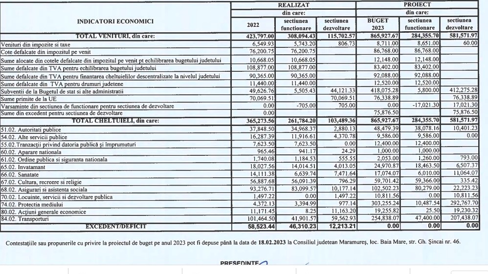 Consiliul Județean Maramureș a publicat, la finele săptămanii trecute, proiectul de buget pe anul 2023. „Conform Legii nr. 273/2006, art. 39 alin (3): Pe baza veniturilor proprii şi a sumelor repartizate potrivit alin. (2), ordonatorii principali de credite, în termen de 15 zile de la publicarea legii bugetului de stat în Monitorul Oficial al României, Partea I, definitivează proiectul bugetului local, care se publică în presa locală sau se afişează la sediul unităţii administrativ-teritoriale. Locuitorii unităţii administrativ-teritoriale pot depune contestaţii privind proiectul de buget în termen de 15 zile de la data publicării sau afişării acestuia”, spun oficialii Consiliului Județean Maramureș.