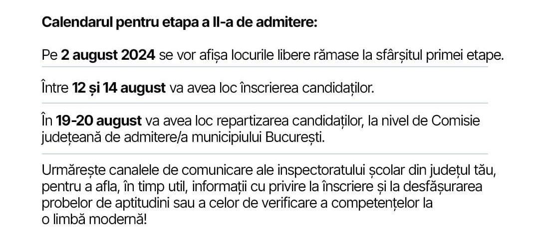 • 5 august – înscrieri pentru probele de aptitudini sau probele de verificare a cunoștințelor de limbă modernă/ maternă desfășurate în a doua etapă a admiterii în învățământul liceal;