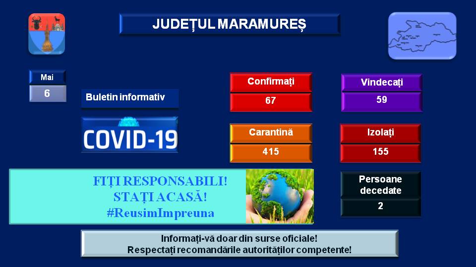 În județul Maramureș a scăzut numărul persoanelor confirmate cu coronavirus. Dacă până marți, 5 mai, cifra era de 76 de persoane pozitive, miercuri numărul a coborât la 67.