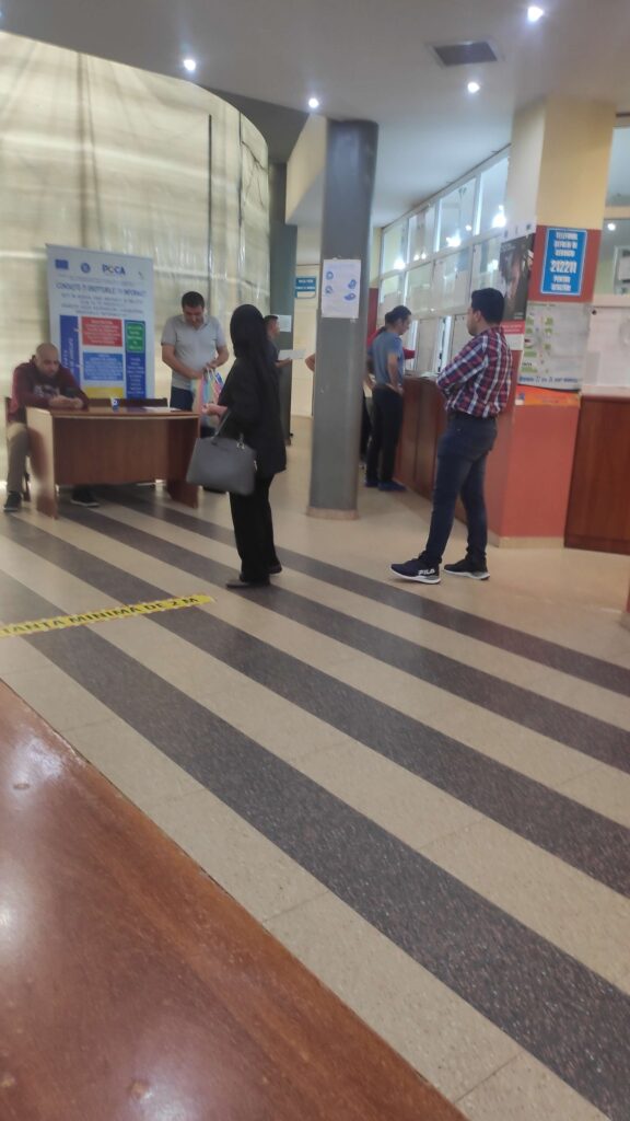 Ce s-a întâmplat de fapt și de ce au ieșit oamenii din clădire… În prima parte a anului, imobilul a intrat în reabilitare, iar lucrările respective au loc în paralel cu activitatea desfășurată la serviciile de Pașapoarte și Permise/Înmatriculări. Greu de imaginat așa ceva, dar asta e realitatea. Sute de persoane care trec pragul instituțiilor respective pentru a li se elibera documentele solicitate trebuie să suporte condițiile unui șantier, cu tot ce presupune acesta: praf, mirosuri înțepătoare, zgomote puternice. Așa e pe șantier, e drept, dar nu așa ar trebui să fie și în instituții publice intens tranzitate. Iar dacă sunt afectate persoanele care petrec o jumătate de oră sau o oră acolo, e limpede în ce condiții lucrează personalul angajat. Închiși în birouri fără geamuri exterioare, cei care primesc sau eliberează documente nu au altă sursă de aer decât holul pentru public, unde sunt condițiile pe care le aminteam: de șantier.