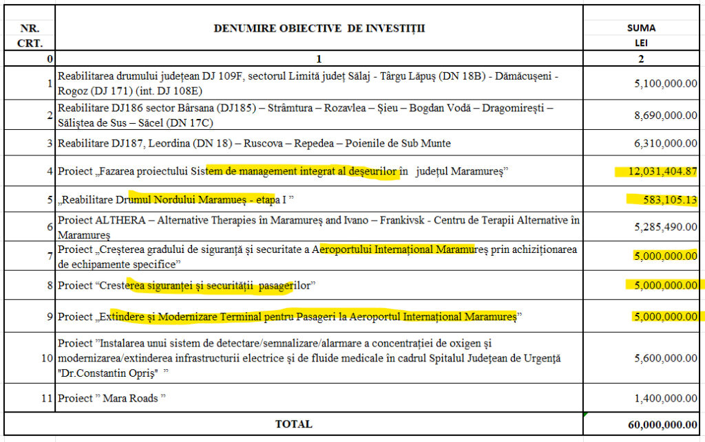 Mai jos, Anexa anterior invocată, dar modificată, conform Hotărârii de CJ 408, din octombrie 2023, cu două săptămâni înainte ca Ioana Stamatoiu, directorul Aeroportului Internațional Maramueș, să ceară date suplimentare, pentru a-și face catârul cu burduful lui Ionel… În această ”anexă cu update”, Ionel și-a aprobat 15.000.000 lei pentru proiectul de la Aeroport și a tăiat un drum, cu totul, de pe listă, a înjumătățit alocarea pentru proiectul cu deșeurile și a redus cu aproape 8.500.000 lei finanțare reabilitării Drumului Nordului Maramureș.