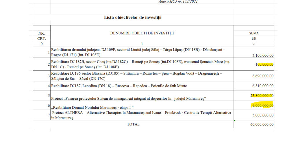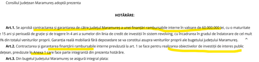 Apropo de modus operandi, vă propunem o analiză legată de Hotărârea de CJ nr. 142, din iulie 2021, prin care Ionel Bogdan aproba contractarea unui credit – plătibil în 15 ani din banii maramureșenilor – de 60 milioane de lei pentru a finanța o listă de obiective de investiții de interes public.