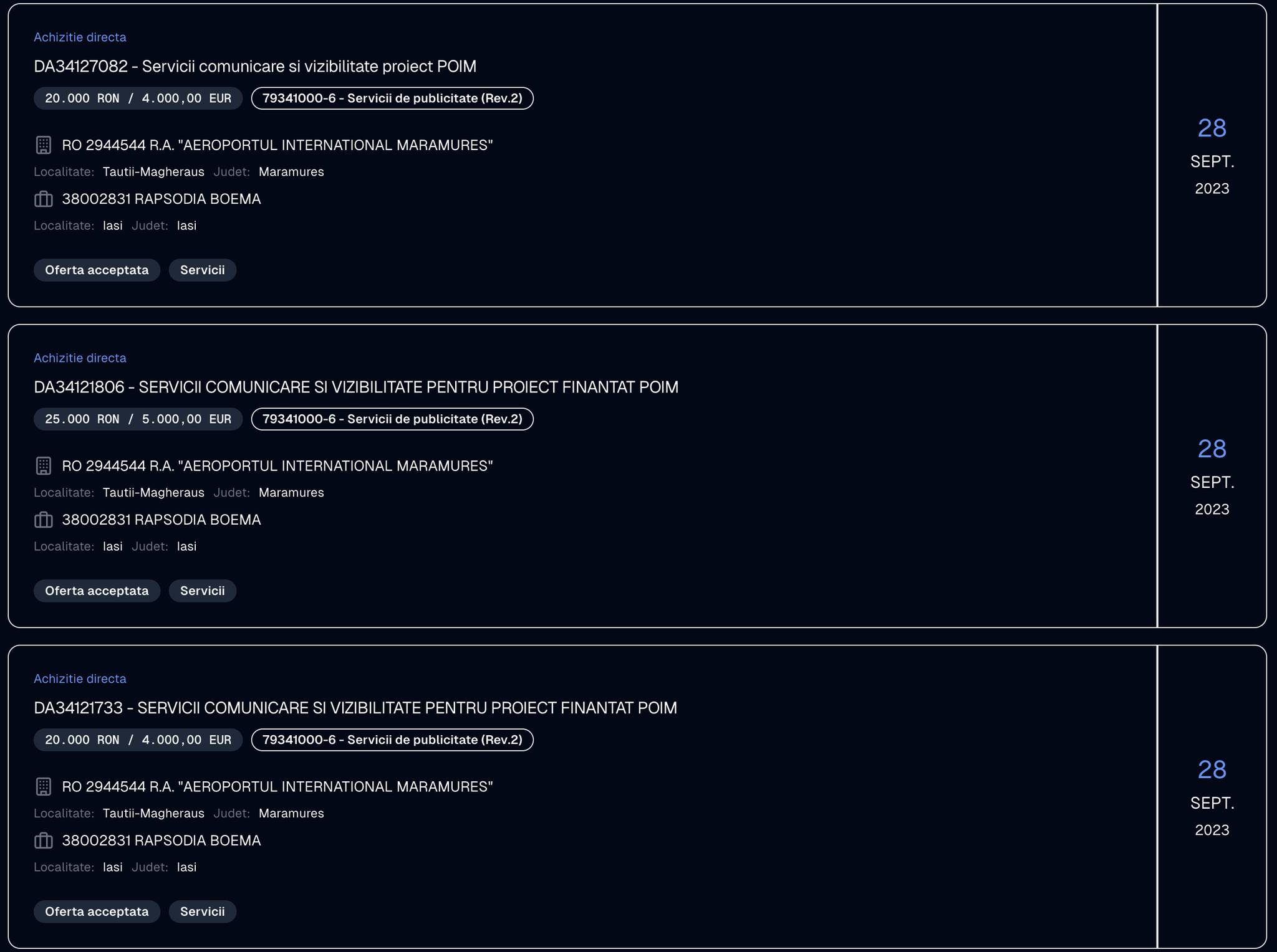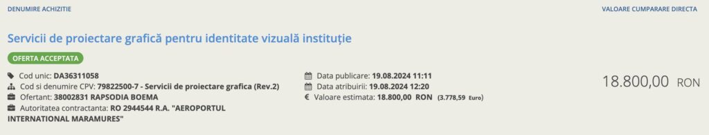 Varianta pe scurt, că nu avem vreme să o lungim. În luna august, pe finalul mandatului ilustrei Ioana Daniela Stamatoiu, ajunsă, rod al hazardului, director general al Aeroportului Maramureș, instituția a achiziționat, direct, fără licitație, servicii de proiectare grafică pentru identitate vizuală. Câștigătoare a fost, pam-pam!, o firmă din Iași, care a mai obținut niște atribuiri directe și în trecut (de exemplu, vreo trei într-o singură zi). Pentru nici 18,8 mii lei, Rapsodia Boema, a reușit să facă o literă grozavă, care va atrage milioane și milioane de pasageri spre Aeroportul din Tăuții Măgherăuș.