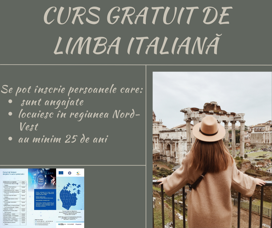 Ai nevoie de 30 de ore pentru a învăța limba italiană. Te așteptăm la cursul gratuit, acreditat ANC, de inițiere, organizat în cadrul proiectului “Formare-Cooperare-Digitalizare: Măsuri pentru promovarea formării profesionale continue în regiunea Nord-Vest”, cod MySmis 135148, și care se desfășoară online, unde vei învăța: