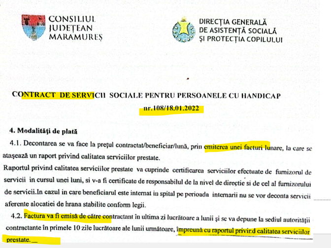 Mai sus, vă prezentăm o captură-foto după primul contract. La p. 4, cel referitor la modalitățile de plată, factura pe care CJ a primit-o (și e adevărat că Ionel Bogdan a pus DGASPC-ul din subordine ca autoritate contractantă, n.red.) trebuia să fie însoțită de un raport privind calitatea serviciilor. Deci Ionel, CJ-ul și DGASPC-ul din subordine ar fi trebuit să știe, atunci când au plătit pentru aceste servicii cu iz funebru, că, plătind, conform contractului, AU GARANTAT PENTRU CALITATEA SERVICIILOR CARE AU DUS LA CURMAREA VIEȚILOR UNOR MARAMUREȘENI! Conform surselor noastre de la nivelul DGASPC si CJ, aceste rapoarte privind calitatea serviciilor fie nu au fost atașate la facturile achitate, deși erau necesare, fie ascundeau realitatea!