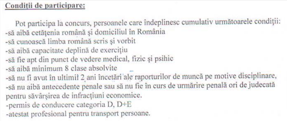 Concursul va avea loc în data de 11 ianuarie, ora 9.00, și va consta în testare reguli de circulație/chestionare (probă eliminatorie), probă traseu și proba interviu.