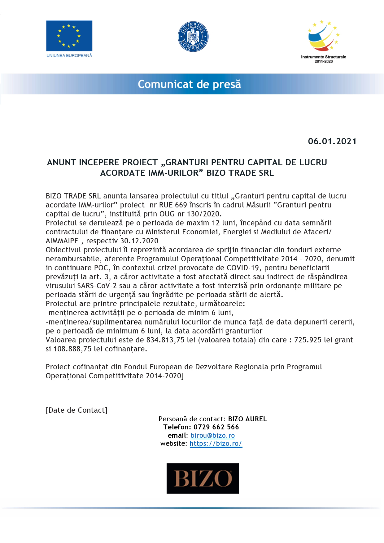 ANUNT INCEPERE PROIECT „GRANTURI PENTRU CAPITAL DE LUCRU ACORDATE IMM-URILOR” BIZO TRADE SRL