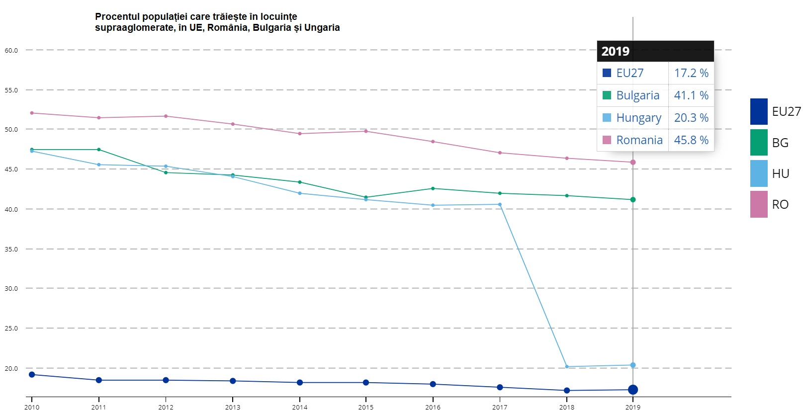 În schimb, doar 7,7% din populația României trăiește în astfel de locuințe subocupate, după care urmează Letonia (9,6%), Grecia (10,7%), Bulgaria (11,5%).