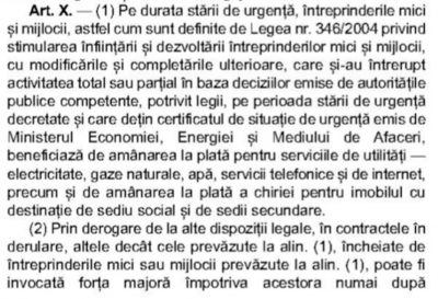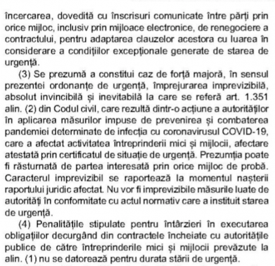 -se redefineste situatia de „forta majora” aplicabila contractelor in derulare. Nu sunt considerate „imprevizibile”, in sensul definirii acestei notiuni, „masurile luate de autoritati in conformitate cu actul normativ care a instituit starea de urgenta”.