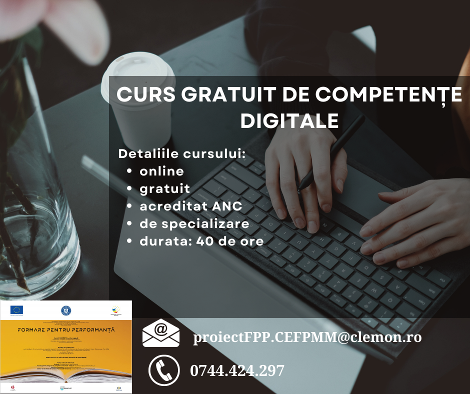 Cursul de competențe digitale este organizat în cadrul proiectului “Formare pentru Performanță”, cod MySmis 134585.