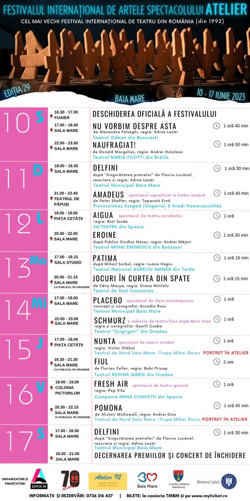 ”Reamintim că Festivalul Internațional de Artele Spectacolului „Atelier” a creat în ultimii treizeci de ani un cadru instituţionalizat pentru afirmarea formelor noi de expresie artistică, a stimulat spiritul de avangardă în teatrul românesc, a creat o rampă de lansare pentru tinerii artişti interesaţi de experienţele novatoare și a oferit companiilor independente posibilitatea de a-şi prezenta producţiile axate în principal pe înnoirea limbajului teatral. În curând punem în vânzare și biletele! Până atunci, vă invităm să vă selectați spectacolele favorite!”, transmite Teatrul Municipal Baia Mare.