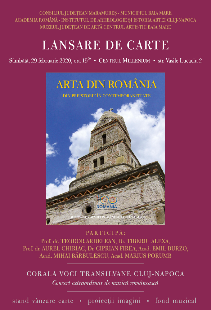 Sambata, 29 februarie, ora 15,00, la Centrul Millenium, str. Vasile Lucaciu nr. 2, sala M1, Institutul de Arheologie si Istoria Artei al Academiei Romane Cluj-Napoca si Muzeul Judetean de Arta «Centrul Artistic Baia Mare» organizeaza lansarea monumentalei lucrari ARTA DIN ROMANIA, vol I-II, aparuta la Editura Academiei Romane & Editura Mega Cluj-Napoca, editori: acad. Razvan Theodorescu & acad. Marius Porumb.