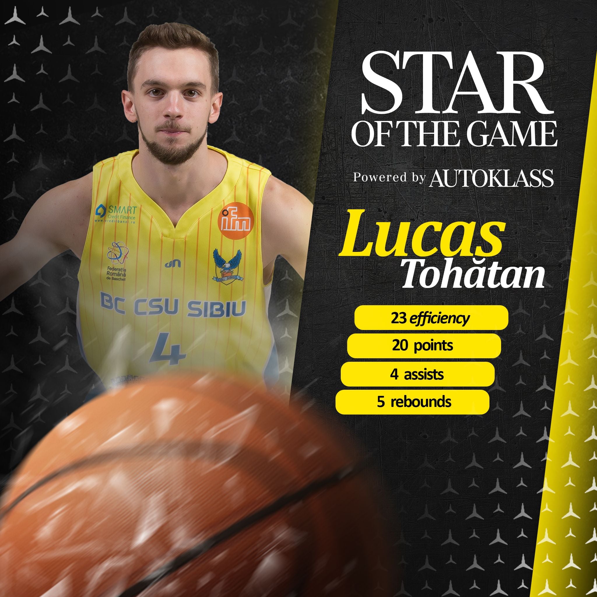 Băimăreanul Lucas Tohătan (BC CSU Sibiu) a înregistrat un career-high în meciul cu Steaua de zilele trecute, când și-a trecut în cont nu mai puțin de 20 de puncte. Tânărul coordonator de joc și-a completat evoluția cu 5 recuperări, 4 pase decisive și un index al eficienței de 23 de unități, primind astfel titlul de „Star of the game” by Autoklass.