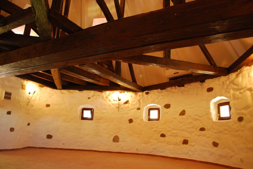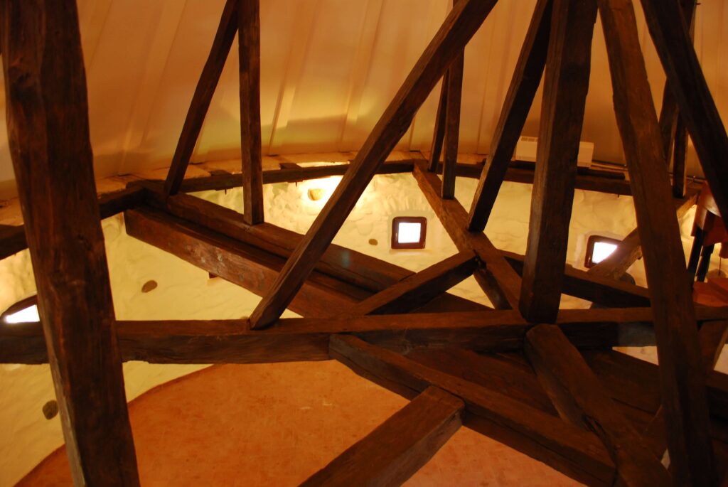Accesul la etaj se face cu o scară de lemn înclinată înspre exterior. Acoperișul este înalt, de formă conică, iar întreaga construcție a acestuia se sprijină pe grinzi de lemn susținute de o grindă foarte groasă, transversală.