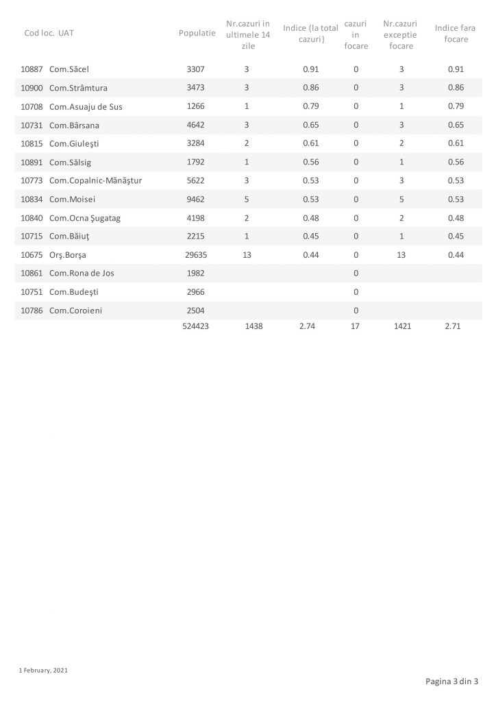 Există și trei comune fără niciun caz în ultimele 14 zile: Rona de Jos, Budești, Coroieni.