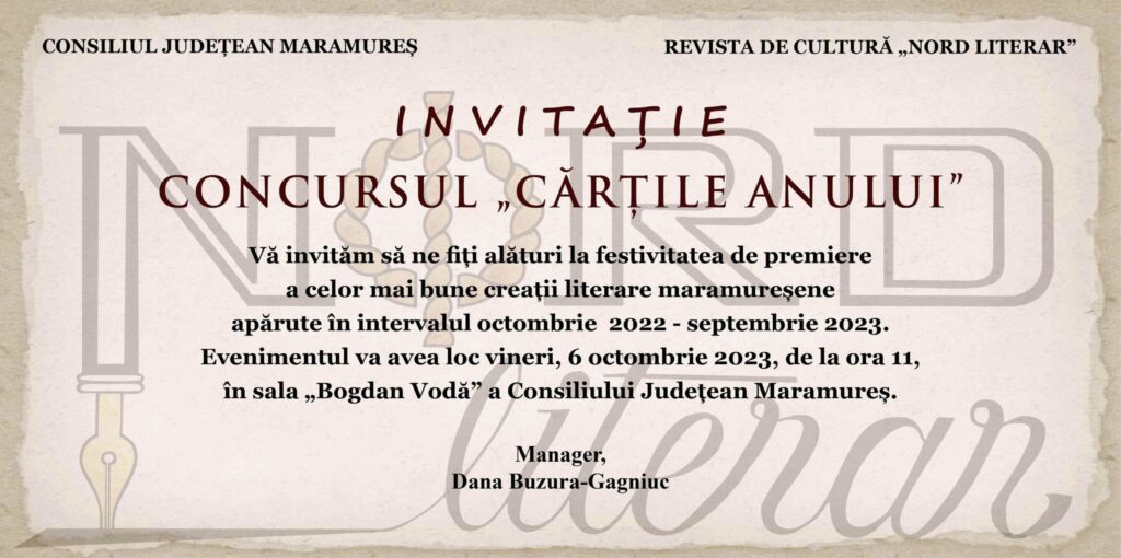Festivitatea de premiere va avea loc vineri, 6 octombrie 2023, începând cu ora 11:00, în Sala ”Bogdan Vodă” a Palatului Administrativ Baia Mare”, a spus Dana Buzura-Gagniuc, manager Revista ”Nord Literar”.