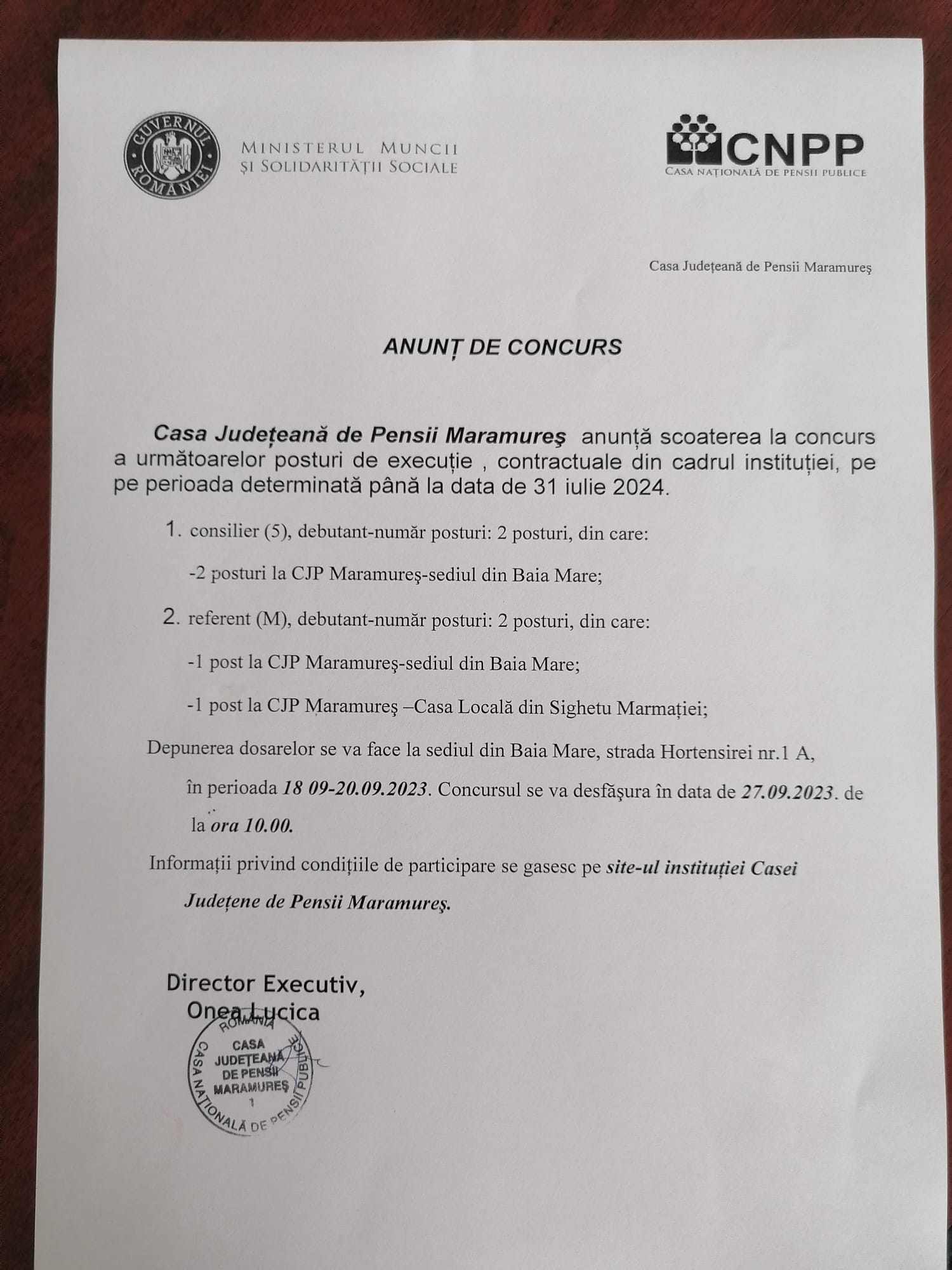 Casa de Pensii Maramureș a anunțat că face angajări. Sunt scoase la concurs un număr de 2 posturi de consilier debutant, respectiv 2 de referent debutant, depunerea dosarelor urmând a se face la sediul Casei Județene de Pensii Maramureș de pe strada Hortensiei din Baia Mare.