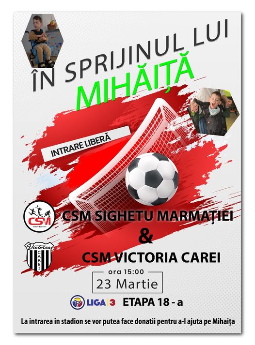 „Avem nevoie de victorie pentru play-off, implicit depinzând și de rezultatul meciului dintre Lotus Băile Felix și CS Minerul Ocna Dej. Club Sportiv Municipal Sighetu Marmatiei invită sighetenii să fie prezenți in număr mare la stadion pentru susținerea echipei și anunță faptul că la intrarea in stadion în locul biletelor de intrare la aceasta partidă deosebit de importantă se vor putea face donații pentru Mihaiță, un băiețel de 5 ani care are probleme de sănătate și mare nevoie de sprijin in continuarea tratamentului, intrarea fiind liberă. La finalul partidei va incepe o licitație pe pagina de facebook a clubului, unde vor fi scoase la vânzare un tricou semnat de toți jucătorii echipei de fotbal și o minge, sperăm noi –mingea calificarii in play-off, iar banii rezultați vor fi redirecționati in scopul sprijinirii tratamentului lui Mihaiță”, spun oficialii CSM Sighetu Marmației.
