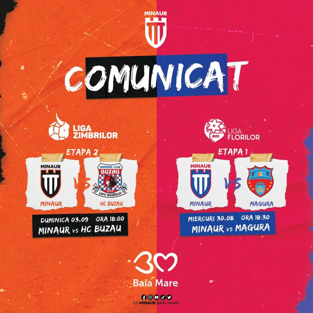 CS Minaur Baia Mare aduce la cunoștința publicului faptul că intrarea la primele două meciuri de handbal oficiale din ediția 2023/2024, care se vor desfășura pe teren propriu, se va face cu bilet de intrare (10 lei) sau cu abonamentul valabil pentru sezonul 2022/2023. Aceste meciuri sunt următoarele: