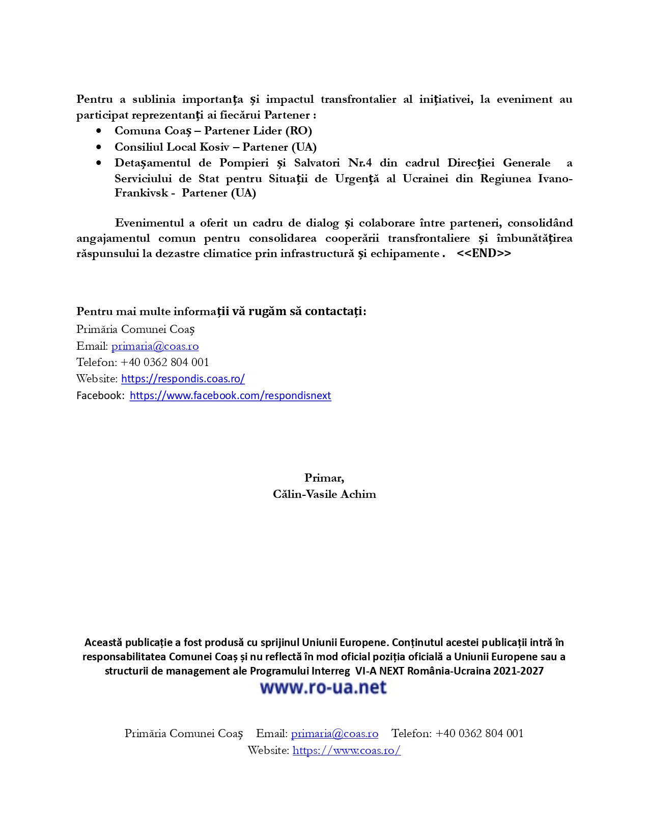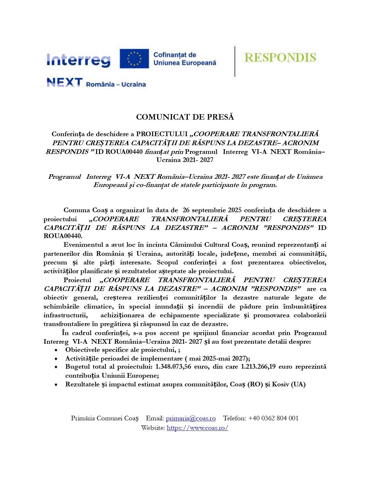 Comuna Coaș a organizat în data de 26 septembrie 2025 conferința de deschidere a proiectului „COOPERARE TRANSFRONTALIERĂ PENTRU CREȘTEREA CAPACITĂȚII DE RĂSPUNS LA DEZASTRE” – ACRONIM ”RESPONDIS” ID ROUA00440.