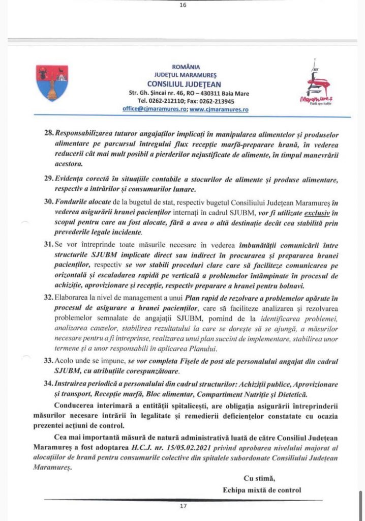 În raportul solicitat și primit de jurnalista Mica Șvab (TL+ Maramureș) se arată că printre nereguli se numără faptul că niciunul dintre meniurile servite pacienților în cursul lunii ianuarie 2021 nu a avut prețul de preparare apropiat de valoarea alocației de hrană.