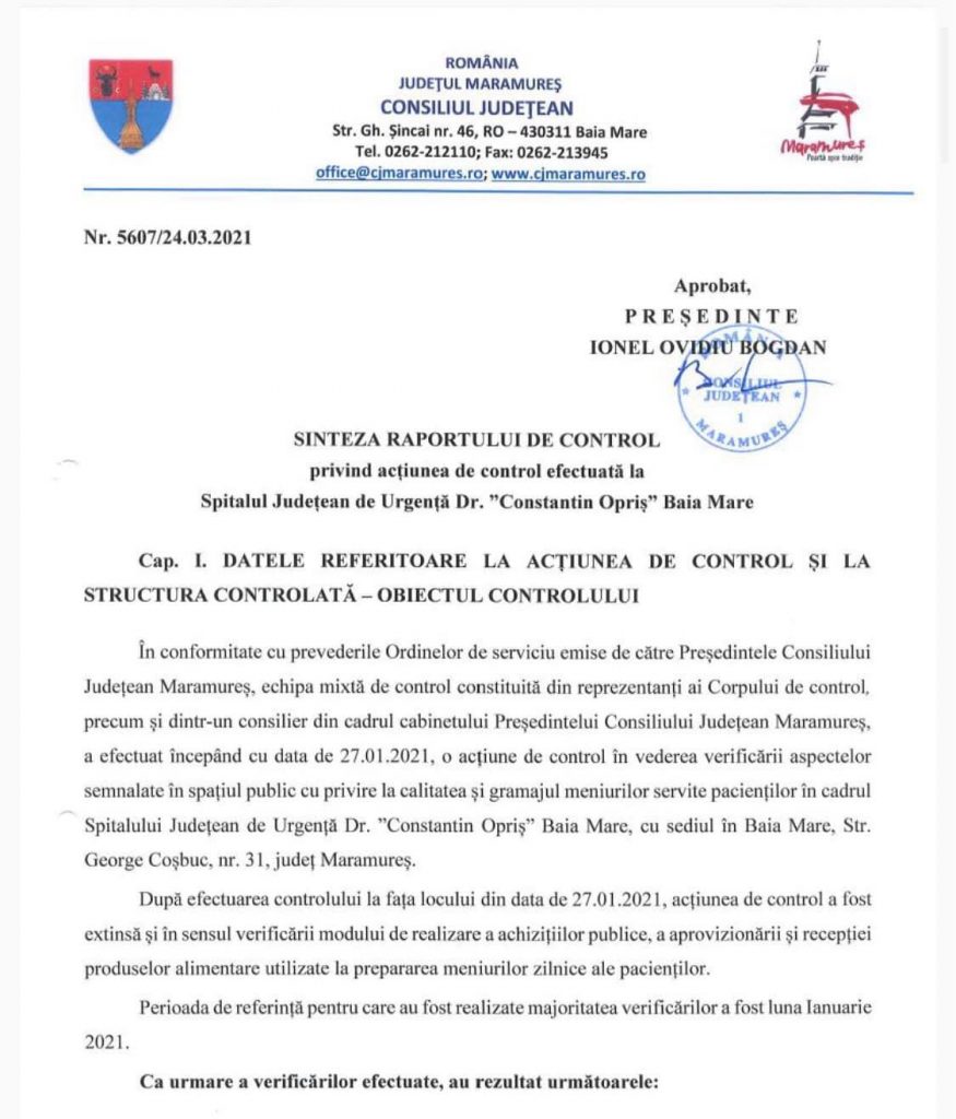 În urma acțiunii de control demarate în 21 ianuarie de către Corpul de Control al Consiliului Județean Maramureș, în vederea verificării aspectelor semnalate în spațiul public cu privire la calitatea și gramajul meniurilor servite pacienților din cadrul Spitalului Județean de Urgență ”Dr. Constantin Opriș” Baia Mare, s-au descoperit o serie de nereguli.