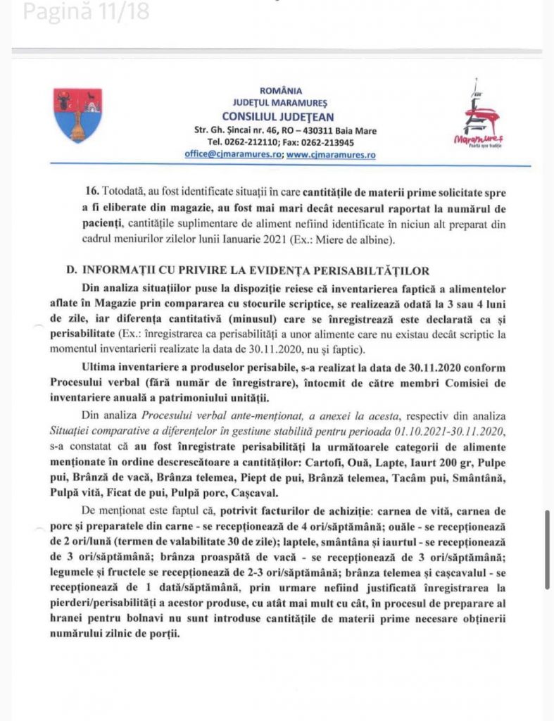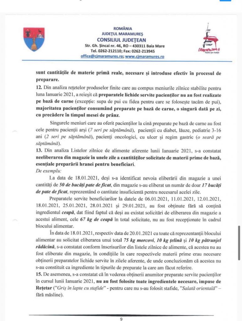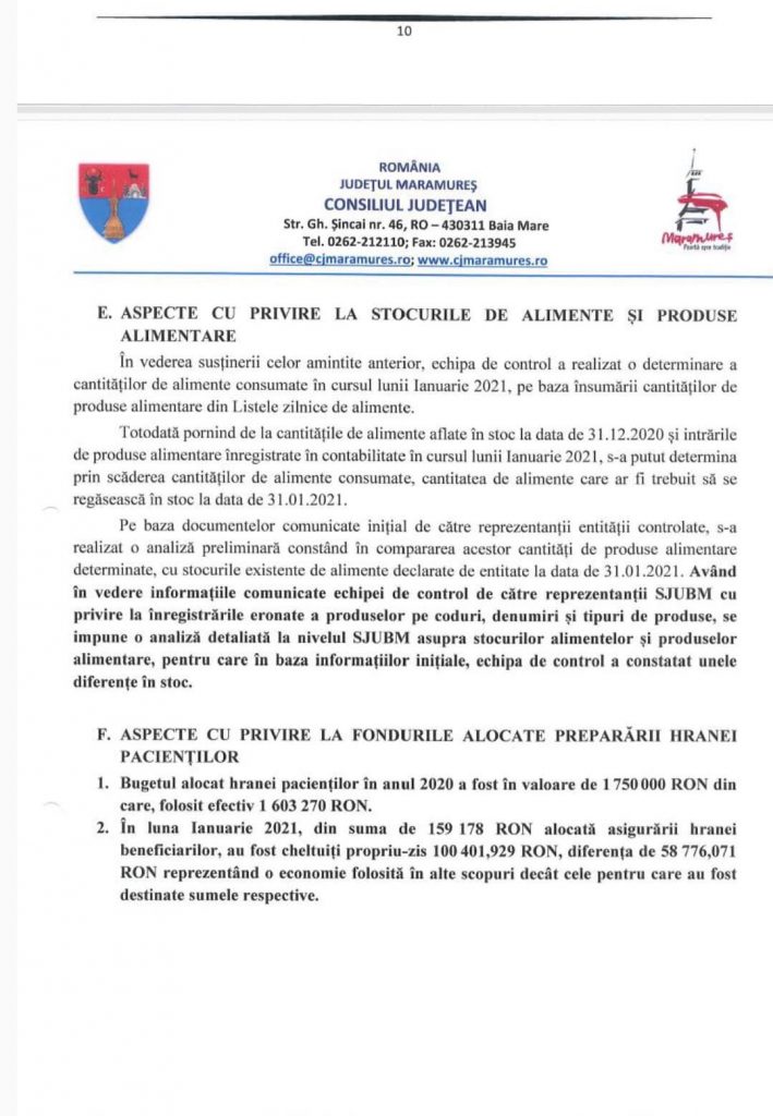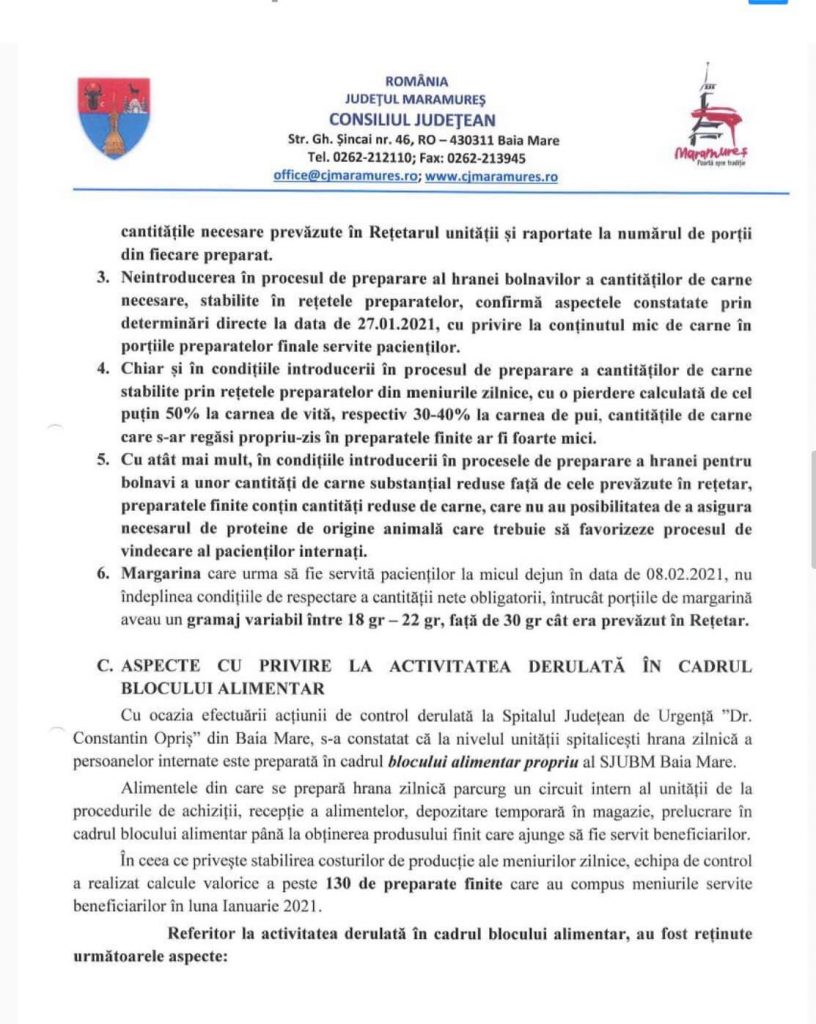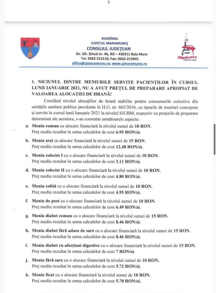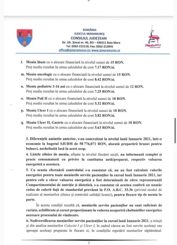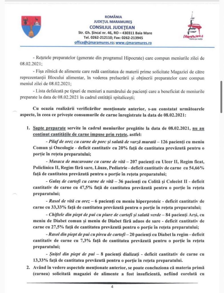 În raportul solicitat și primit de jurnalista Mica Șvab (TL+ Maramureș) se arată că printre nereguli se numără faptul că niciunul dintre meniurile servite pacienților în cursul lunii ianuarie 2021 nu a avut prețul de preparare apropiat de valoarea alocației de hrană.