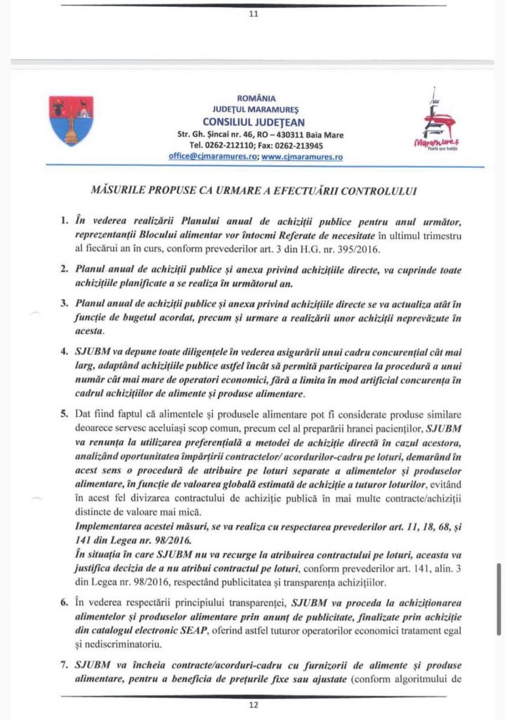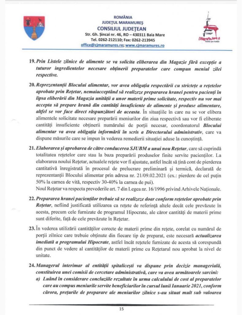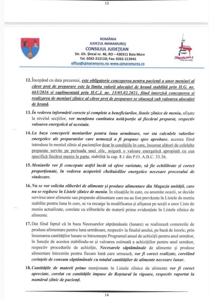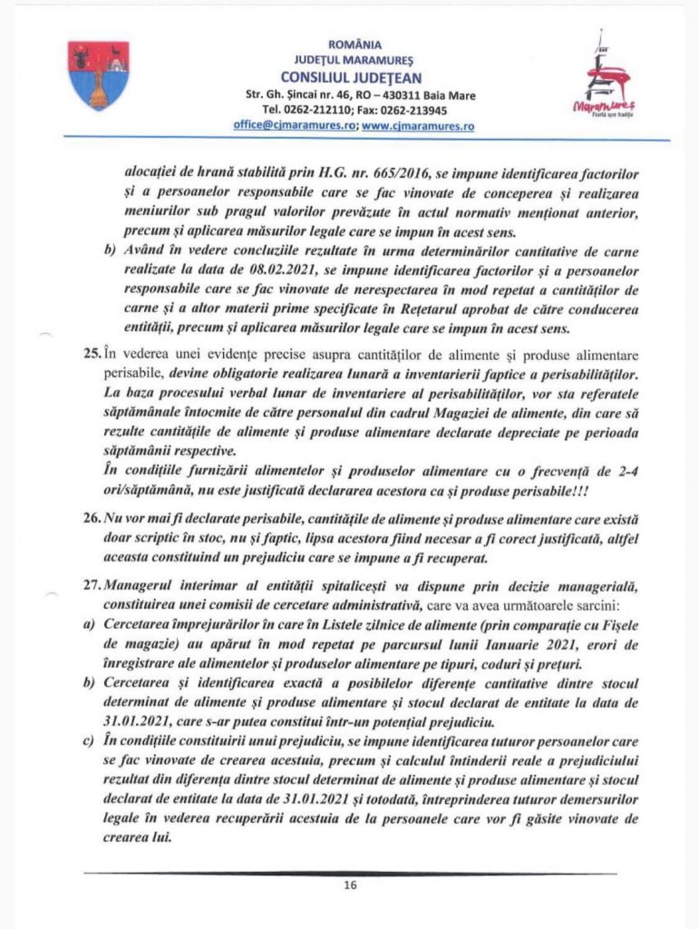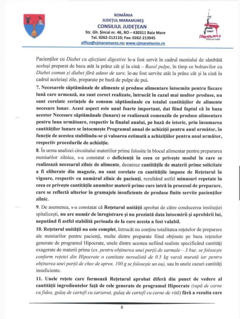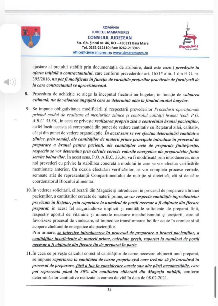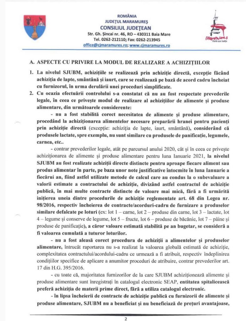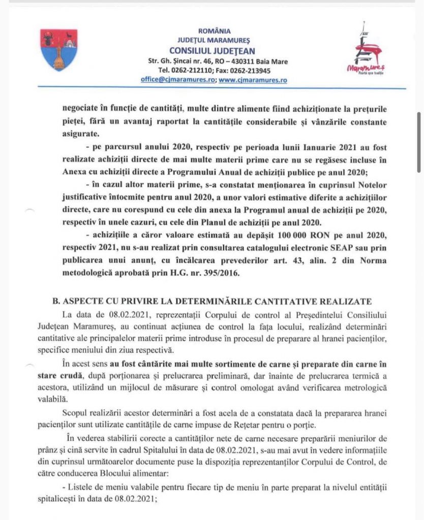 În raportul solicitat și primit de jurnalista Mica Șvab (TL+ Maramureș) se arată că printre nereguli se numără faptul că niciunul dintre meniurile servite pacienților în cursul lunii ianuarie 2021 nu a avut prețul de preparare apropiat de valoarea alocației de hrană.