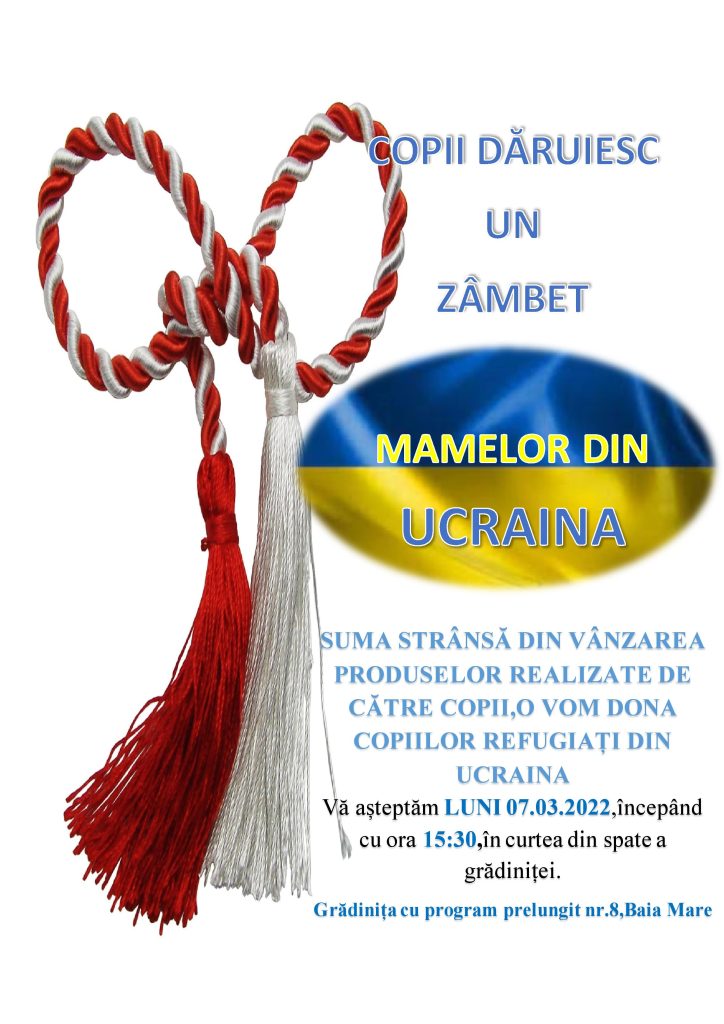 În spiritul acestei idei vine și Grădinița cu Program Prelungit Nr. 8, situată pe strada Horea Nr. 42, director prof. Pop Irina Diana unde „Copiii dăruiesc un zâmbet, mamelor din Ucraina”, care va organiza un târg. Acesta va avea loc luni, 7.03. 2022, de la ora 15.30, în curtea grădiniței. Clienții târgului cu vânzare de produse vor fi părinții celor 6 grupe cu program prelungit și a celor 5 grupe cu program normal. Obiectele puse în vânzare în cadrul târgului vor fi confecționate de micuți, sub îndrumarea educatoarelor, pe tot parcursul acestei săptămâni, iar părinții sunt liberi să îi răsplătească cu cât vor crede de cuviință.