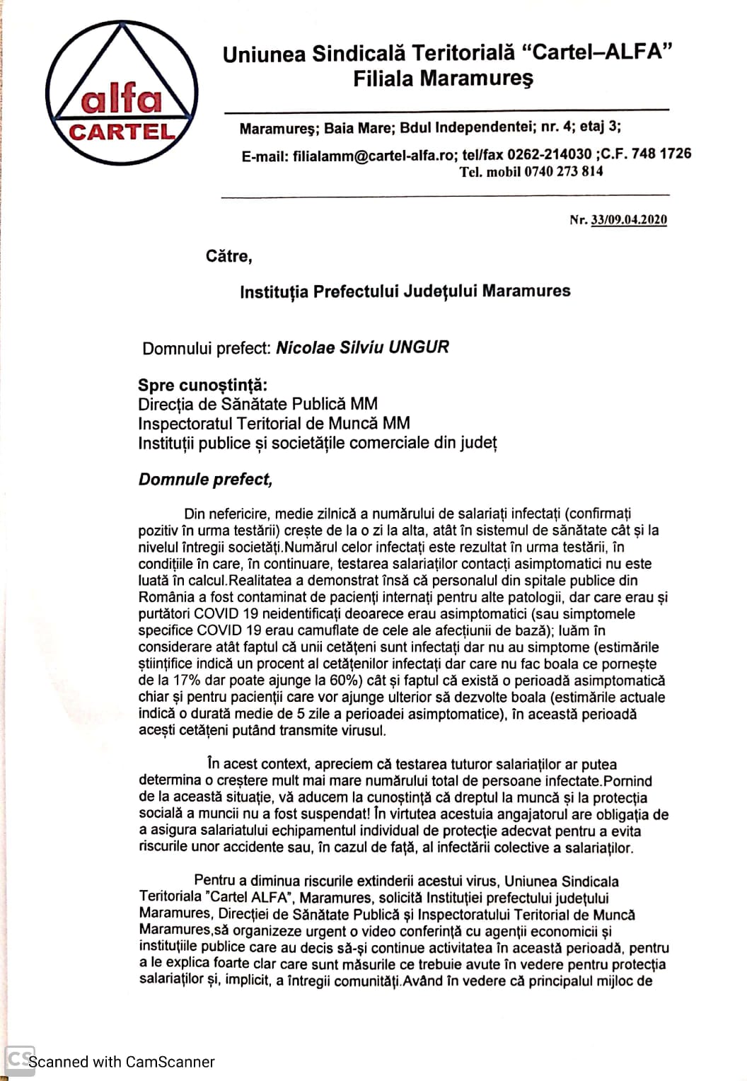 Cartel Alfa Maramureș solicită prefectului de Maramureș să fie testați toți angajații din județ. Solicitarea a fost trimisă ieri de sindicat și este semnată de Gheorghe Florin Hossu, președintele Cartel Alfa Maramureș.