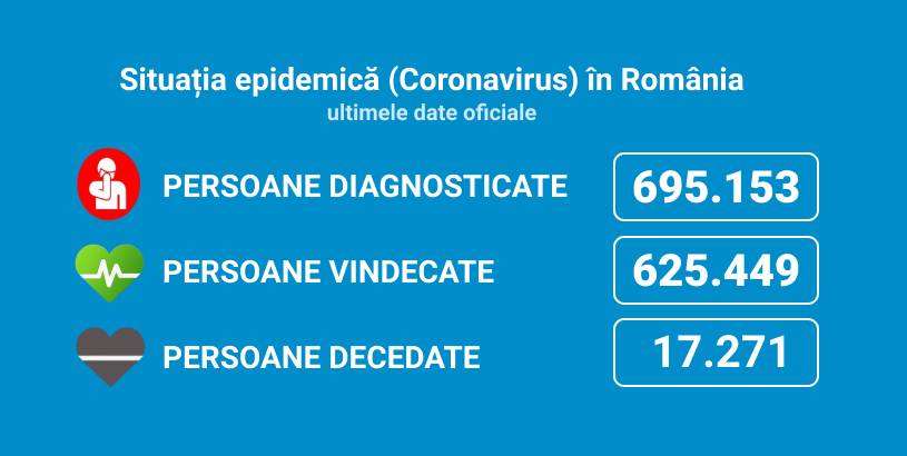 Până astăzi, 18 ianuarie, pe teritoriul României, au fost confirmate 695.153 de cazuri de persoane infectate cu noul coronavirus (COVID – 19). 625.449 de pacienți au fost declarați vindecați.