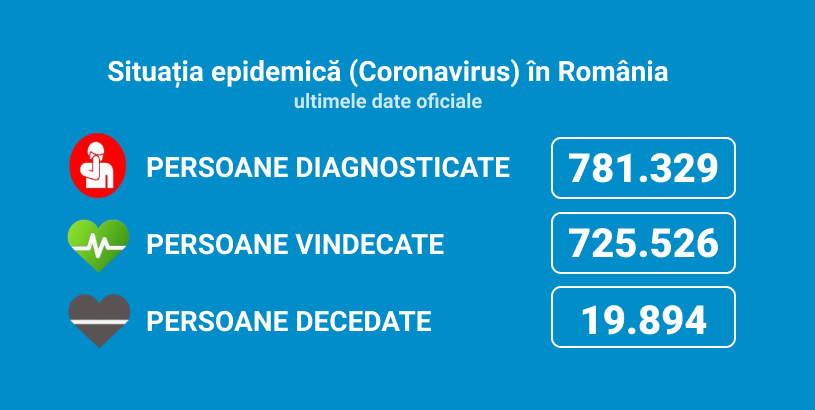 Până astăzi, 22 februarie, pe teritoriul României, au fost confirmate 781.329 de cazuri de persoane infectate cu noul coronavirus (COVID – 19). 725.526 de pacienți au fost declarați vindecați.
