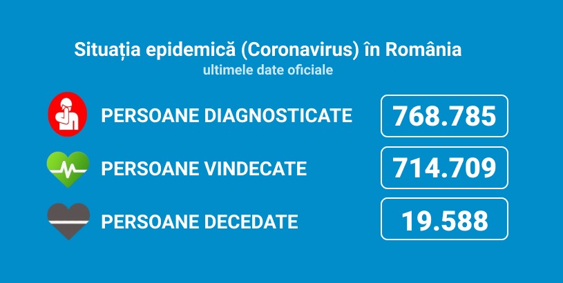 Până astăzi, 17 februarie, pe teritoriul României, au fost confirmate 768.785 de cazuri de persoane infectate cu noul coronavirus (COVID – 19). 714.709 pacienți au fost declarați vindecați. În urma testelor efectuate la nivel național, față de ultima raportare, au fost înregistrate 2.815 cazuri noi de persoane infectate cu SARS – CoV – 2 (COVID – 19), acestea fiind cazuri care nu au mai avut anterior un test pozitiv.