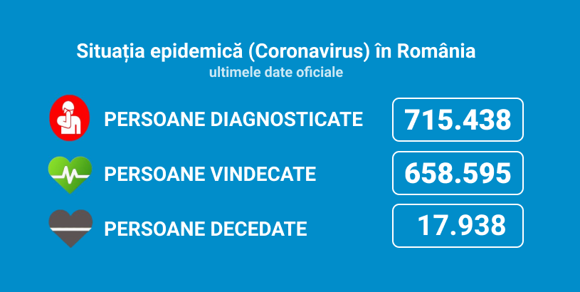 Până astăzi, 26 ianuarie, pe teritoriul României, au fost confirmate 715.438 de cazuri de persoane infectate cu noul coronavirus (COVID – 19). 658.595 de pacienți au fost declarați vindecați.