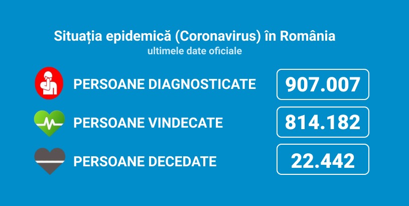 Până astăzi, 23 martie, pe teritoriul României, au fost confirmate 907.007 cazuri de persoane infectate cu noul coronavirus (COVID – 19). 814.182 de pacienți au fost declarați vindecați.