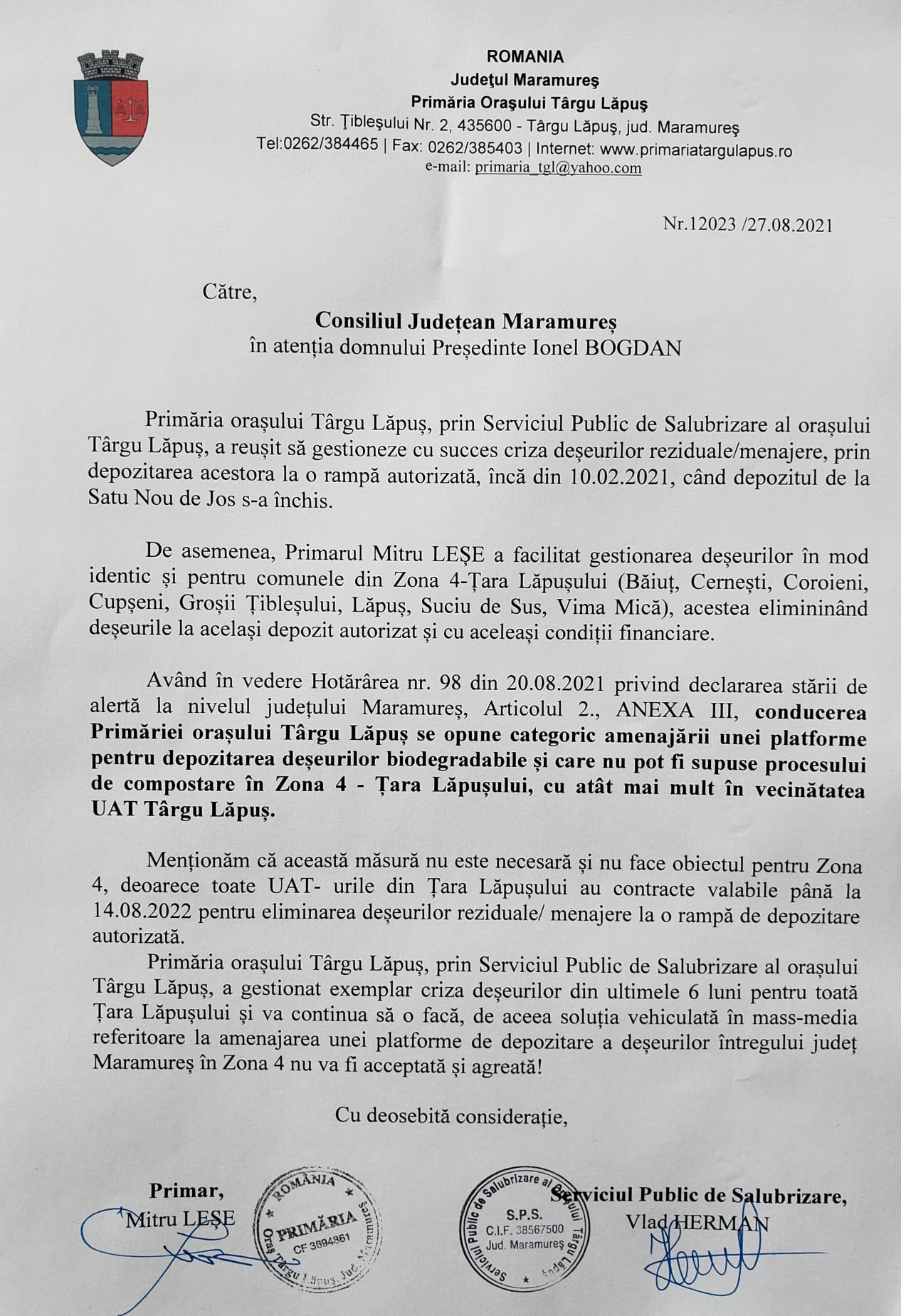 „Primăria Târgu Lăpuș a facilitat gestionarea deșeurilor și pentru comunele din Zona 4 – Țara Lăpușului și anume Băiuț, Cernești, Coroieni, Cupșeni, Groșii Țibleșului, Lăpuș, Suciu de Sus și Vima Mică, acestea eliminând deșeurile la același depozit autorizat și cu aceleași condiții financiare. Având în vedere Hotărârea 98 din 20 august 2021 privind declararea stării de alertă la nivelul județului Maramureș, conducerea Primăriei orașului Târgu Lăpuș se opune categoric amenajării unei platforme pentru depozitarea deșeurilor biodegradabile și care nu pot fi supuse procedurii de compostare în Zona 4- Țara Lăpușului, cu atât mai mult în vecinătatea UAT Târgu Lăpuș.