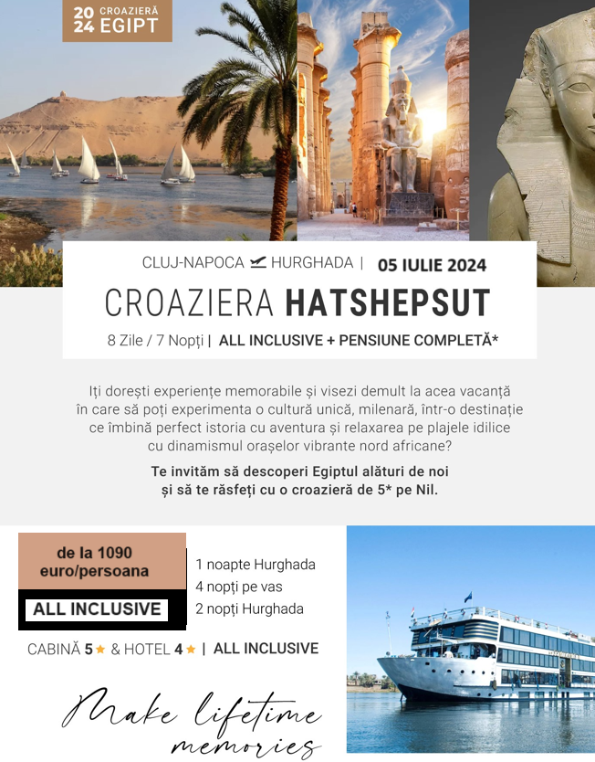Mara International Tour vă poftește la o croazieră de neuitat, în Egipt, pe Nil. Șapte nopți, all inclusive, preț de la 1090 euro/ persoană, cu zbor din Cluj.