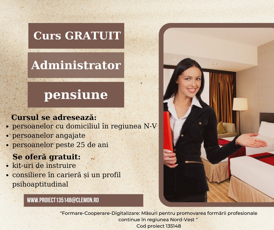 Dacă eşti angajat, cu domiciliul în regiunea Nord-Vest și ai peste 25 de ani, S.C. CLEMON S.R.L. vine în sprijinul tău și îți pune la dispoziție cursul gratuit de ➡ADMINISTRATOR PENSIUNE TURISTICĂ!
