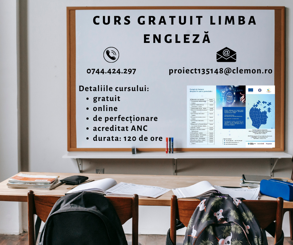 Cursul de limba engleză este organizat în cadrul proiectului “Formare-Cooperare-Digitalizare: Măsuri pentru promovarea formării profesionale continue în regiunea Nord-Vest”, cod MySmis 135148.