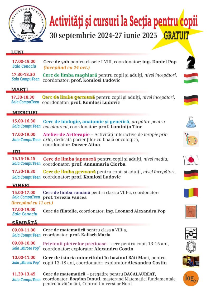Începând din 30 septembrie până în 27 iunie anul viitor, la secția de copii a Bibliotecii Județene ”Petre Dulfu” se organizează mai multe activități și cursuri gratuite. De la cursuri de limba germană și limba japoneză până la cercuri de șah, de matematică ori de istoria mineritului. Programul îl găsiți mai jos.