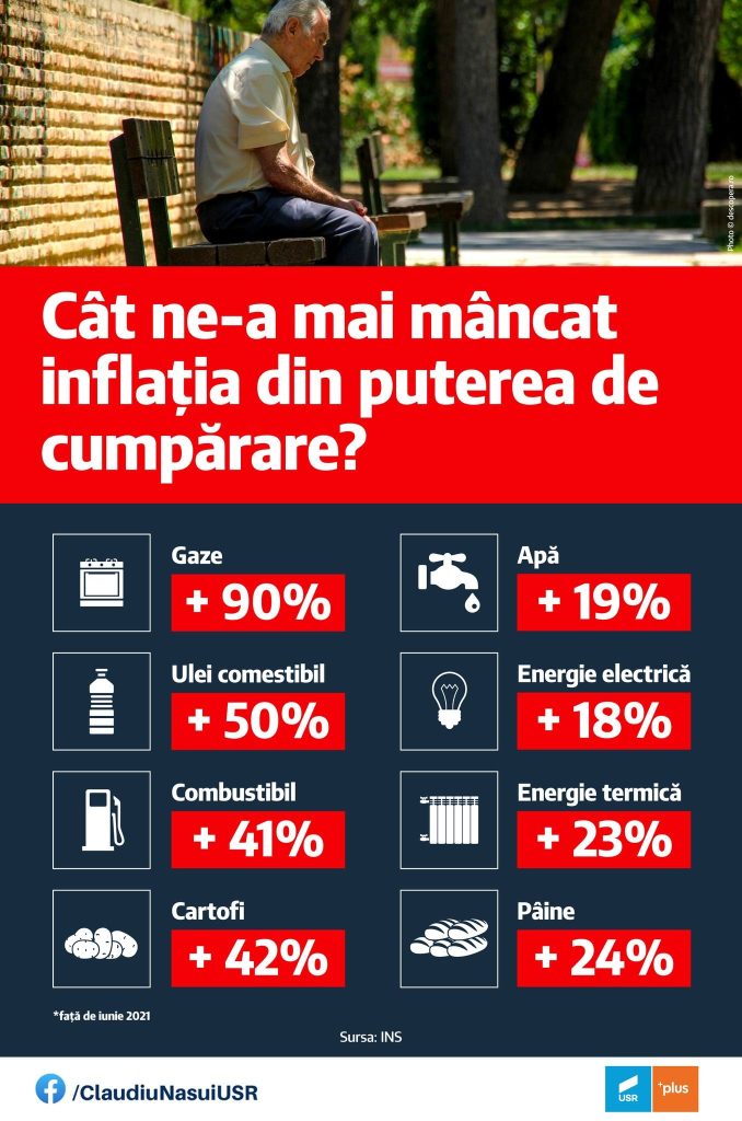 „Inflația a ajuns la 15,1%, deși previziunile BNR erau de maxim 10%, iar din cauza bâlbelor Guvernului, intervenția Băncii Naționale a fost tardivă. Facturile la gaze sunt cu 90% mai scumpe, față de anul trecut, iar cele la curent cu 17%… cu toate acestea, Guvernul nu iese din starea latentă în care pare că se scufundă din ce în ce mai mult, trăgând în mocirlă întreaga populație din România. Alimentele s-au scumpit cu 15% mai mult decât anul trecut, cartofii sunt mai scumpi cu 42%, iar pâinea cu 24%. Mărfurile nealimentare sunt cu 17,8% mai scumpe, iar serviciile cu 7,8% față de iunie 2021.