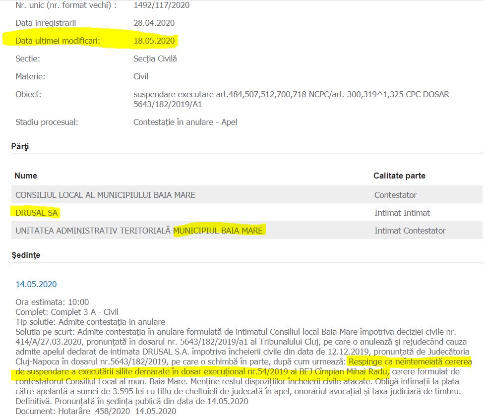 Miercuri, 20 mai 2020, executorii judecătorești vor pune sechestru pe bunurile mobile și imobile ale Primăriei Baia Mare. Societatea de salubritate Drusal SA a obținut la Tribunalul Cluj încuviințarea executării Primăriei pentru o parte din sumele datorate (Dosar nr.5643/182/2019). Iar dacă cele două entități nu vor ajunge la un acord de ultim moment privind reeșalonarea datoriilor, vom asista la o nouă premieră negativă marca Cătălin Cherecheș.