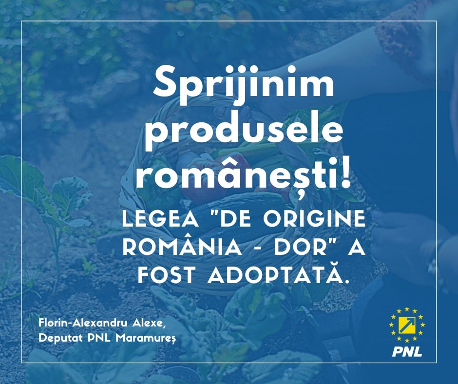 Deputatul PNL de Maramureș, Florin-Alexandru Alexe spune că în Camera Deputaților a fost votat proiectul de lege privind instituirea Schemei de Certificare Voluntară “De Origine România – DOR”, prin care vor fi sprijinite produsele românești.