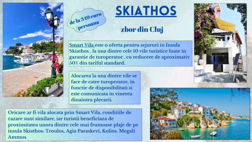 Se spune că Insula Skiathos este un tărâm binecuvântat de zei, căci frumusețea insulei depășește cu mult ceea ce ar putea realiza omul cu mâna lui. Pe Insula Skiathos te vei bucura de peisaje sublime în care sunt presărate obiective turistice fascinante, hoteluri și retaurante primitoare precum și o viață de noapte cosmopolită.